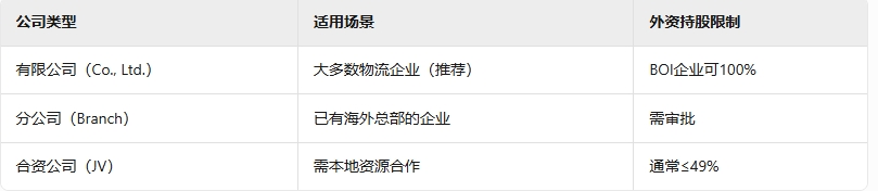 ?有限公司(Co., Ltd.)??:外资可100%控股(需BOI支持),适合中大型物流企业。