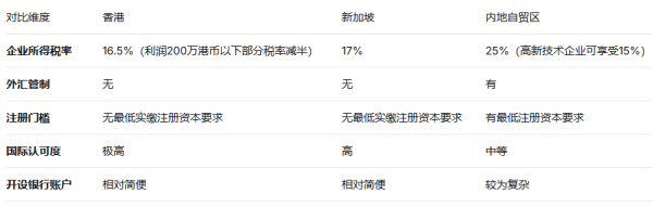 同时,香港没有外汇管制,资金自由流动,企业所得税率仅为16.5%,且实行属地征税原则,海外收入一般无需在港纳税。与常见出海目的地对比,香港的优势更为明显: