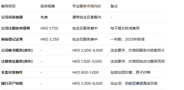 费用透明化分析是建立信任的关键。注册香港公司的费用主要由政府规费、专业服务费和额外服务费三部分组成。以下是基于2025年标准的费用估算: