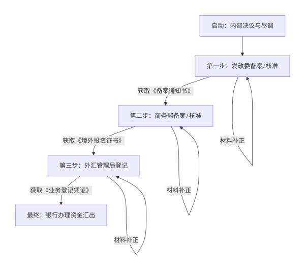 标准的ODI备案流程可视为一个“两步走、一汇出”的串联过程,涉及发改、商务、外管三大部门。