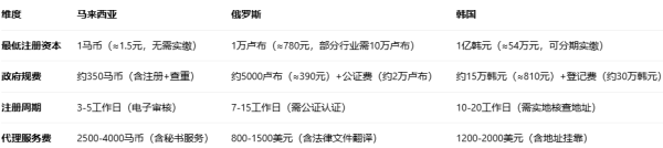 结论?:马来西亚注册门槛最低(1马币注册资本+3天拿证),适合初创企业;韩国注册资本要求高(54万元),适合资金充足的中大型企业;俄罗斯需额外承担公证认证成本(约占总费用30%),隐性支出较多。