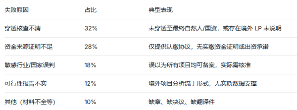 根据我们收集的 120 个有限合伙企业 ODI 备案案例,失败或被退回的主要原因分布如下: